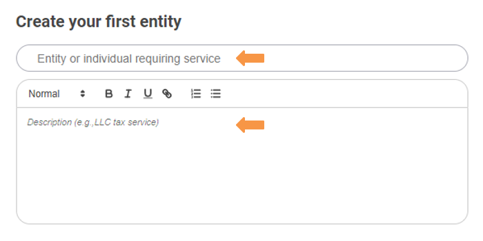 - Enter your Entity Name and a concise description of essential elements describing your entity.