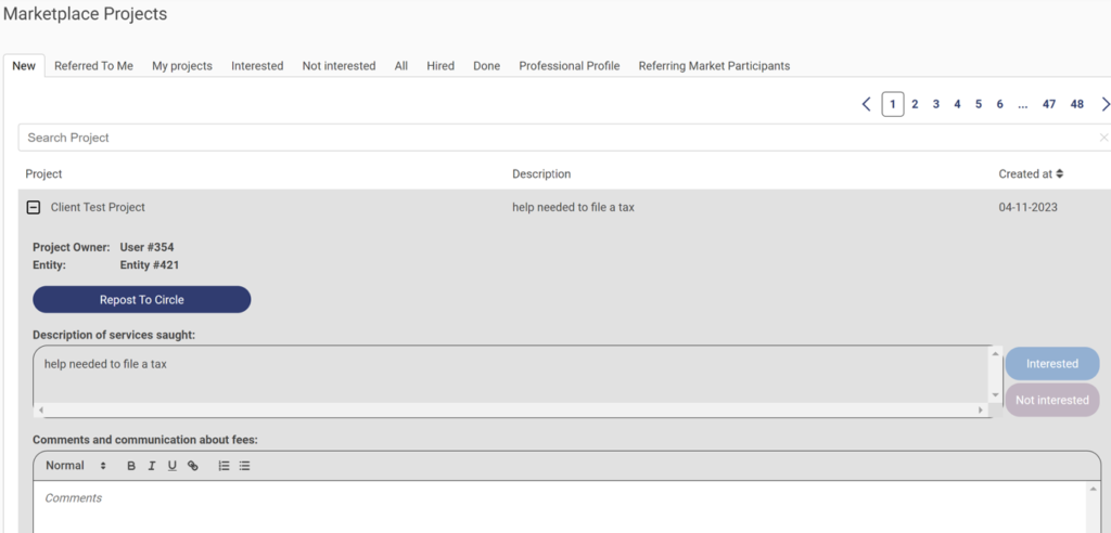 10. Also, Client user can view the Projects created under Marketplace Projects > New tab (client Test Project is created)