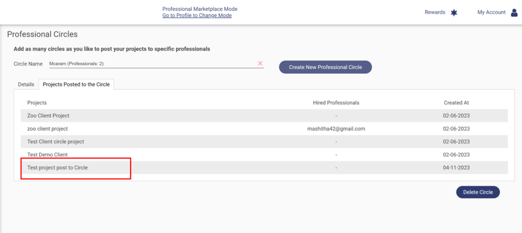 13. Circle owner can see this project in–Professional Circle > Projects Posted to the Circle. (In Professional Login)