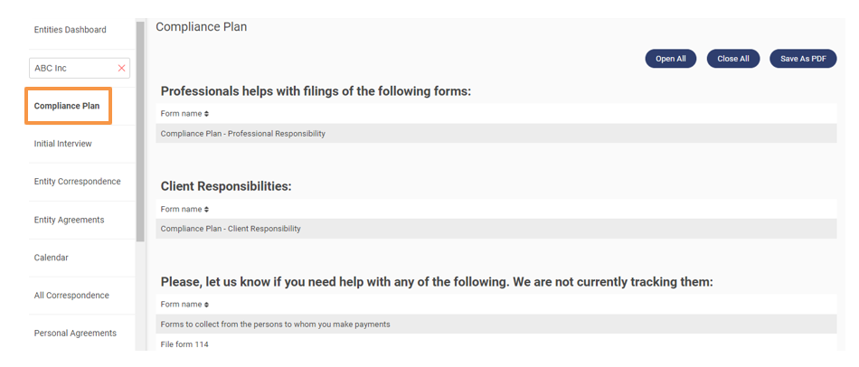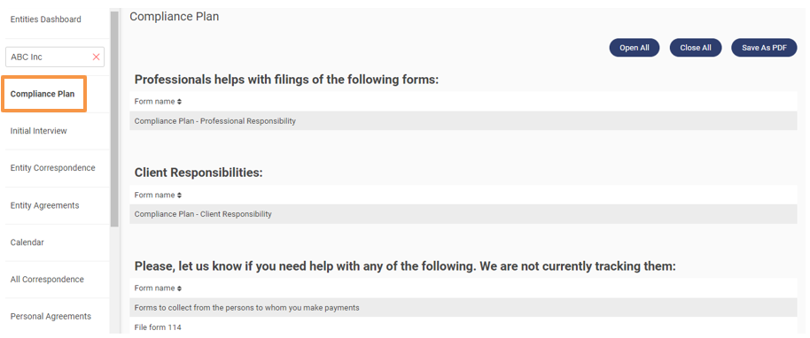 Please note that Compliance Plan needs to be continually updated as the client’s compliance needs change such as new filing requirements. The filings that are no longer needed will be removed.
