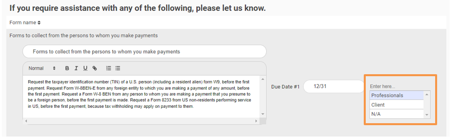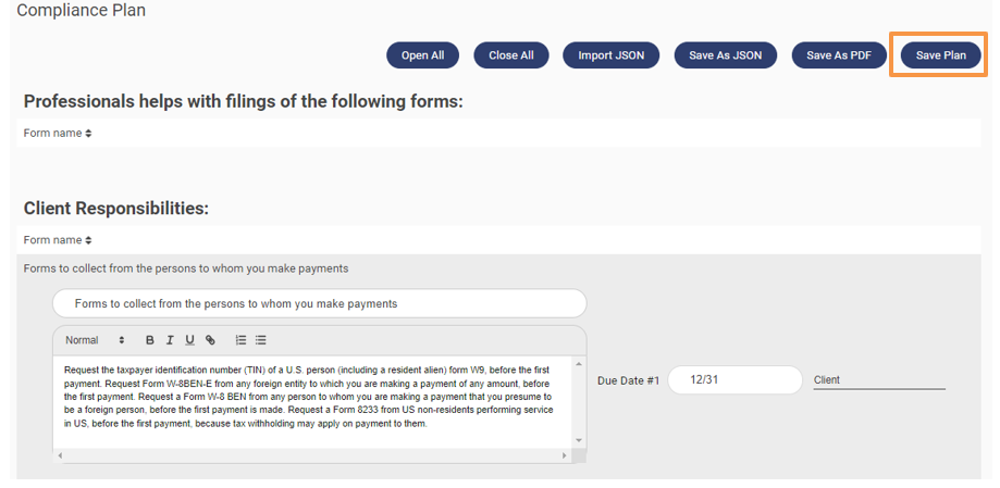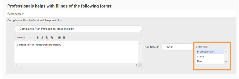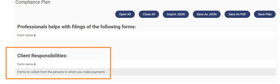 Based on each compliance requirement, the professional can assign responsibility for each compliance plan to the Client or Professional.