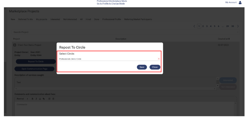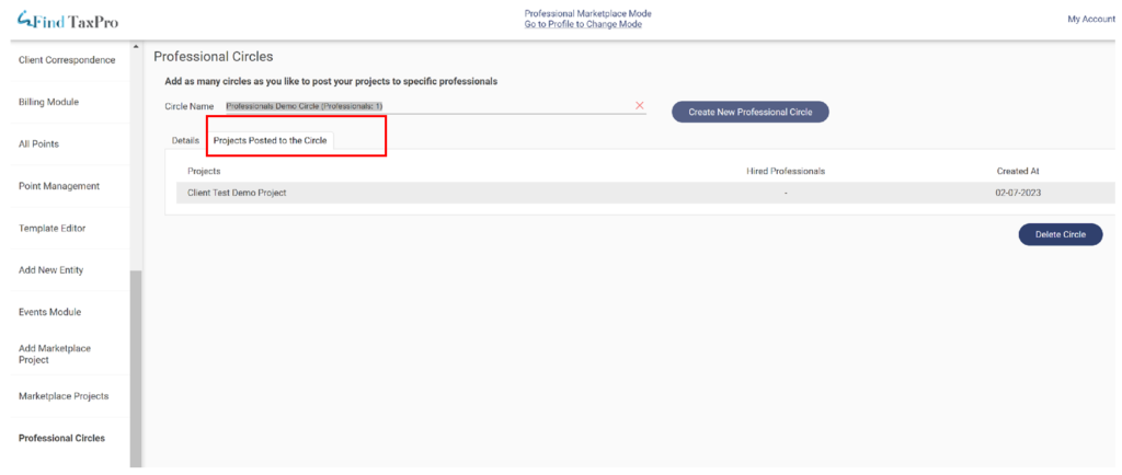 5. Click on the Tab “Projects Posted to the Circle” ???? and we can see that the “Client Test Demo Project” is posted to the Professional Circle.